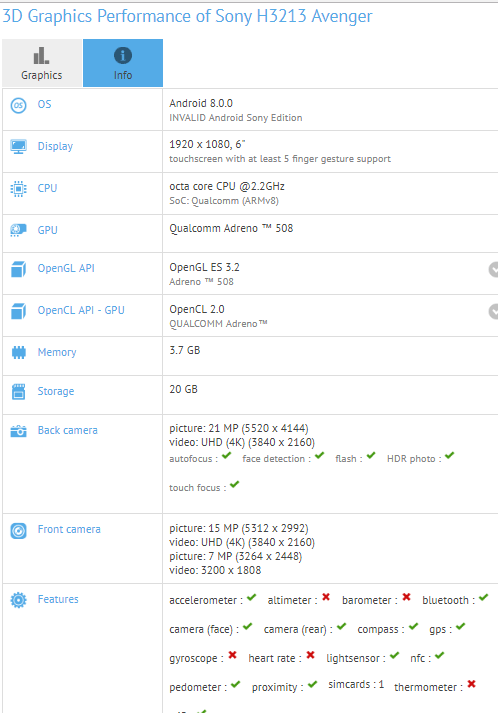 Le specifiche del Sony H3213 Avenger elencate su GFX Bench comprendono un display di 6 pollici di risoluzione 1920×1080 pixel, processore octa-core a 2.2GHz con GPU Adreno 50, 4GB di RAM, 32GB di memoria interna, fotocamera da 21MP posteriore che cattura anche in 4k e fotocamera frontale con coppia di sensori 16MP + 8MP.