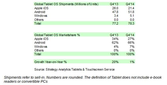 Il rapporto di Strategy Analytics rileva che Apple ha registrato una quota del 27% del mercato dei tablet nel trimestre, rispetto al 34% di un anno prima. Apple ha visto una crescita del 6,6% nel mercato in tutto il 2014. "La quota di mercato Android è salita leggermente a scapito di iPad e ha registrato una quota del 66% del mercato dei tablet", ha detto Peter King di SA, aggiungendo che i tablet Android spediti sono di un totale di 51,8 milioni di unità nel Q4 2014, in crescita dell’8% da 47,8 milioni di un anno prima.