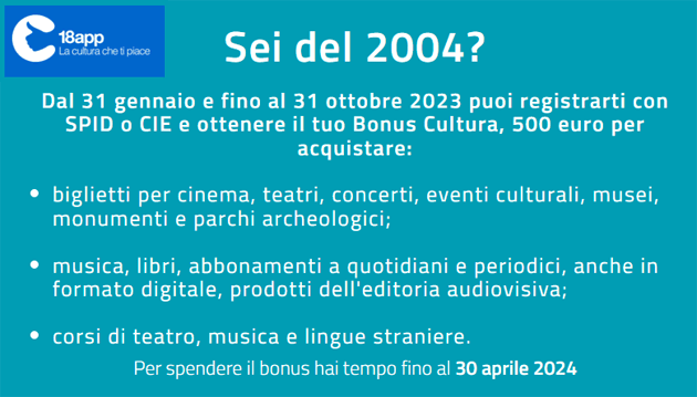 18app – è la web-app accessibile al sito www.18app.it attraverso cui chi ha compiuto 18 anni nel 2023 puo’ ricevere i 500€ da spendere. Possono beneficiare del Bonus Cultura di 500 euro tutti i cittadini residenti nel territorio nazionale (in possesso, ove previsto, di permesso di soggiorno in corso di validità) che hanno compiuto i 18 anni di età nell’anno 2023.