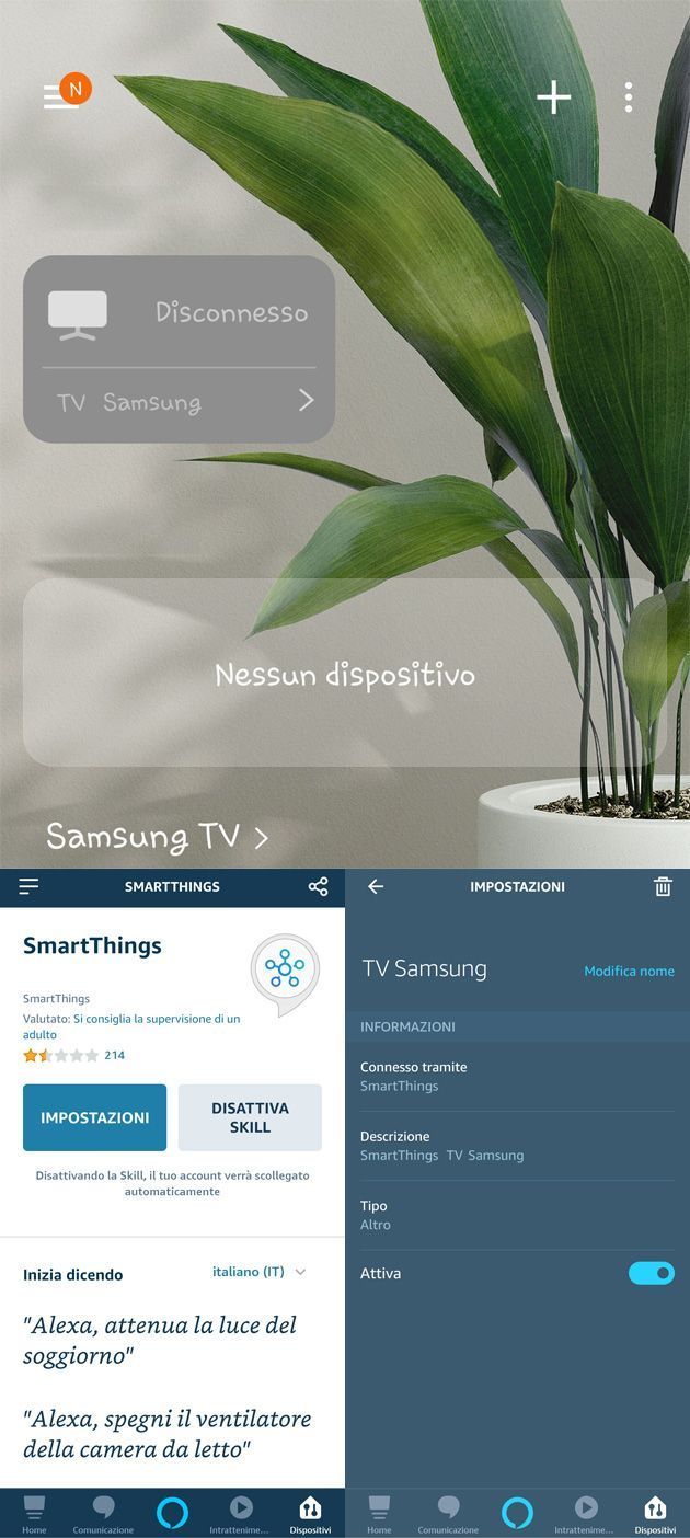 Una volta configurato il proprio TV nell’app Samsung SmartThings sullo smartphone bisogna aprire l’applicazione Amazon Alexa, quindi cercare e installare la skill ‘Samsung Smartthings’, quindi premere ‘Abilita’ e seguire le istruzioni per collegare il proprio account Samsung SmartThings con il proprio account Alexa. Fatto anche questo è possibile cercare ‘nuovi dispositivi’ nell’app Alexa per trovare in pochi secondi il televisore Samsung (si puo’ anche dire ‘Alexa, trova nuovi dispositivi’). Al termine della configurazione dei nuovi dispositivi ‘TV’ trovati è possibile dire "Alexa, accendi/spegni [nome dato al Samsung TV]" o altri comandi compatibili (elenco di esempi a fondo pagina).
