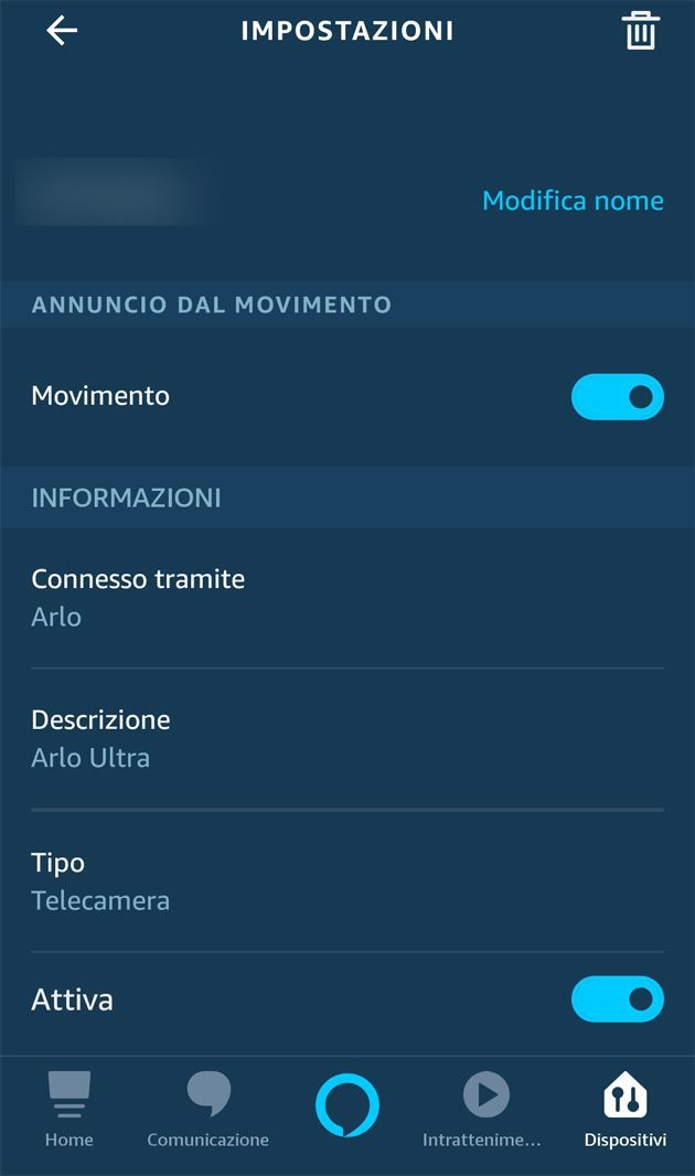 Per fare in modo che Alexa faccia un annuncio quando viene rilevato un movimento su una videocamera Arlo:
