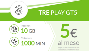 Tre PLAY GT5: 10 Giga e 1000 minuti a 5 euro ogni 4 settimane